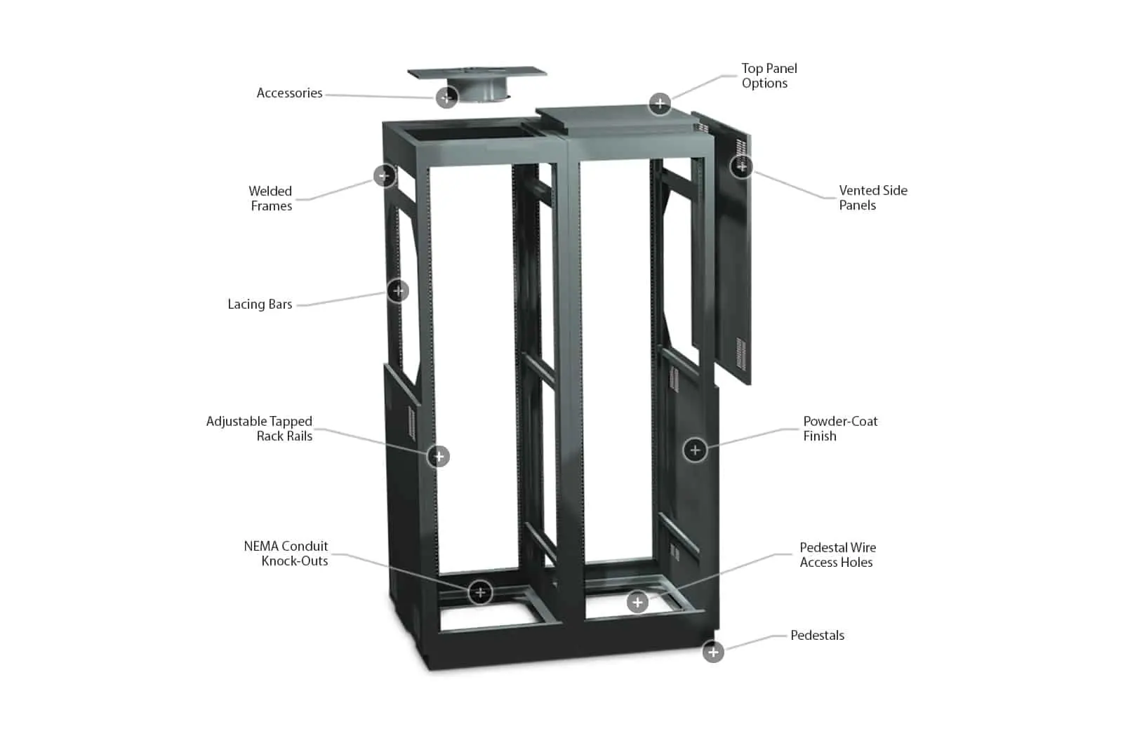 Individual racks include a variety of top options – raised vented panels, solid/vented blank panels and internal/external mounted fans.