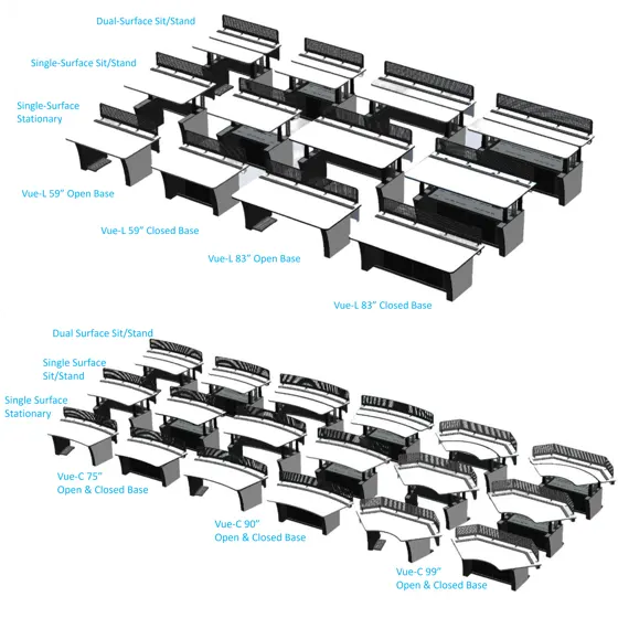 Vue consoles below are arranged by size / style, sit-stand or stationary, and single or dual work surface.