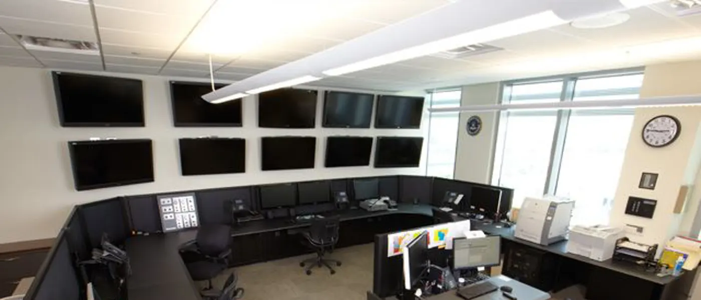 Radio, telecommunications, video surveillance and alarm monitoring come together in a single command center console designed to allow up to five operators to work simultaneously. Winsted’s Sight-Line Console in carbon/graphite provided a sleek, attractive solution that puts critical tools at agents’ fingertips. The console’s U-shaped design provides plenty of opportunity for agents to interact and collaborate.
