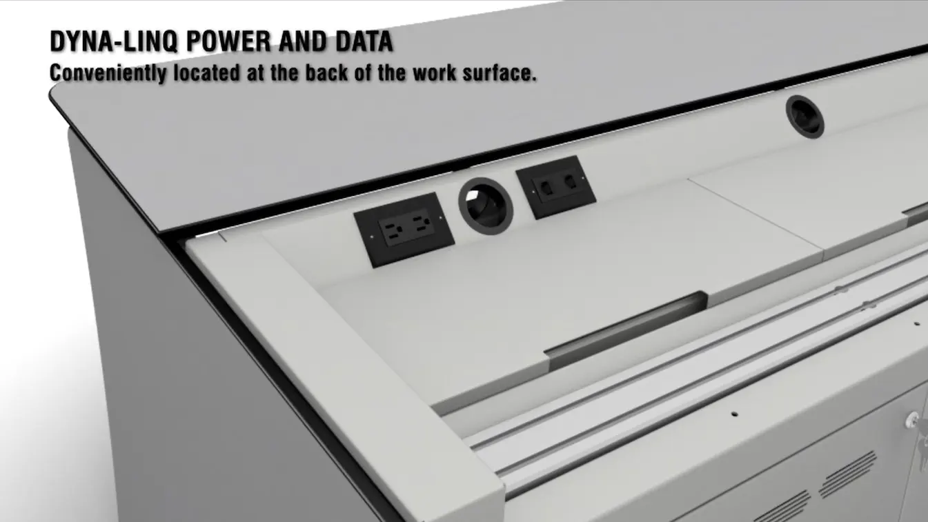 Dyna-Linq is an integrated power outlet system that offers conveniently located power connectivity for monitors or other devices right at the console Versa-Trak. This system can be connected to a power feed via direct hard-wired connection or plug end connection. The system then connects outlets together by using plug in jumpers. Each power outlet is rated at 10 amps.