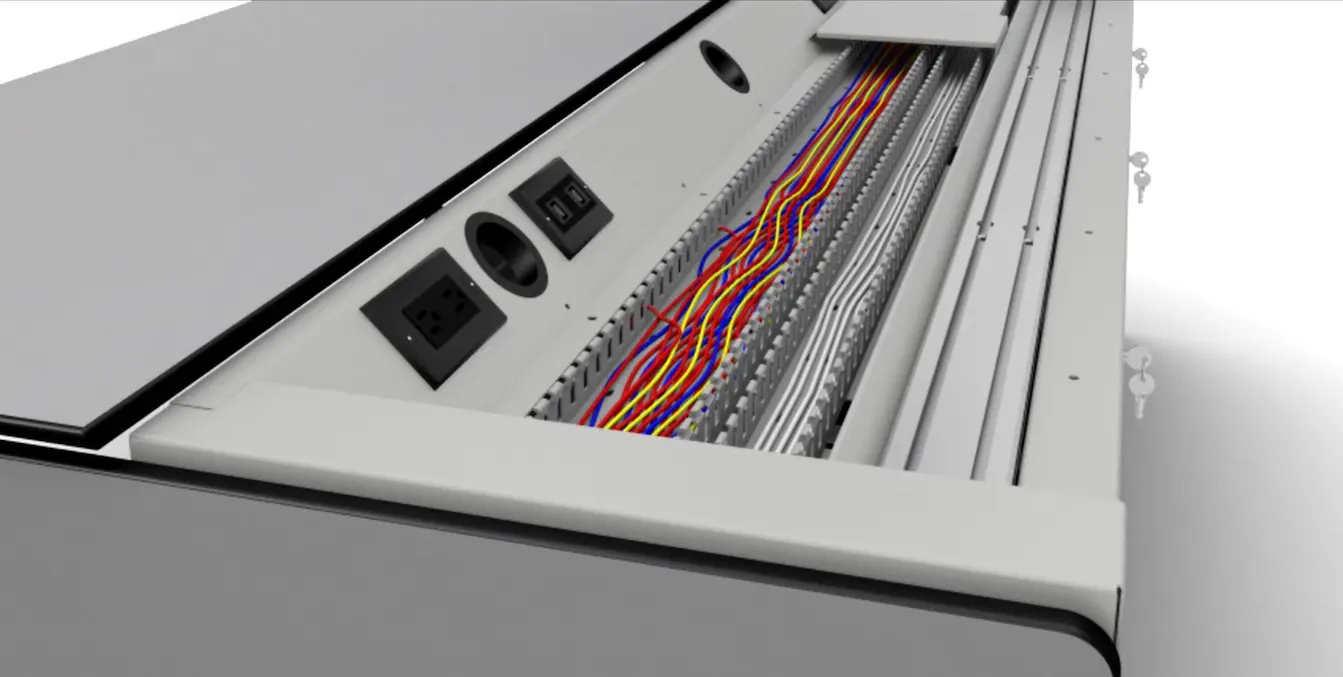 Cable management is a critical part of technology integration and Day-2 service. Sightline offers a continuous cable tray to route cables from one side to the other, even when multiple positions are joined together. Removable covers allow for unobstructed service access to cables.